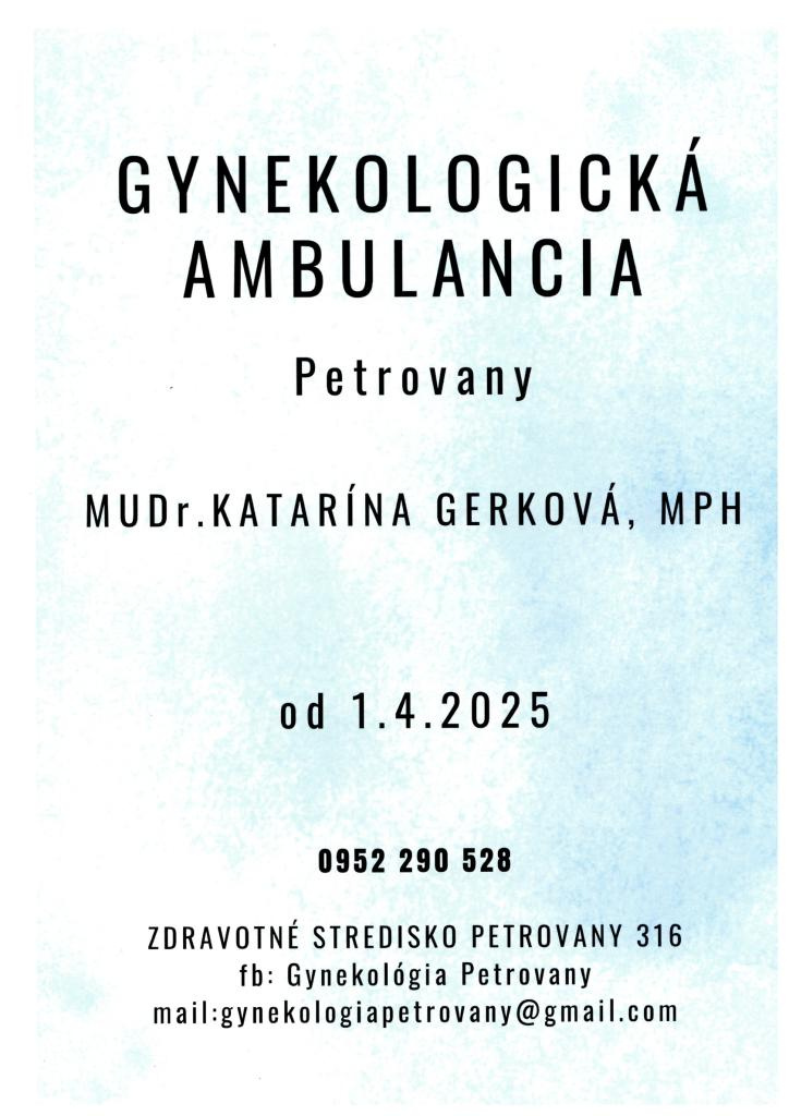 Od 1. apríla 2025 sa v Petrovanoch otvára nová gynekologická ambulancia pod vedením MUDr. Kataríny Gerkovej, MPH. Pre objednanie sa môžete telefonicky spojiť na čísle 0952 290 028 a e-mailom na gynekologiapetrovany@gmail.com alebo navštíviť zdravotné stredisko na adrese 316.
